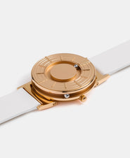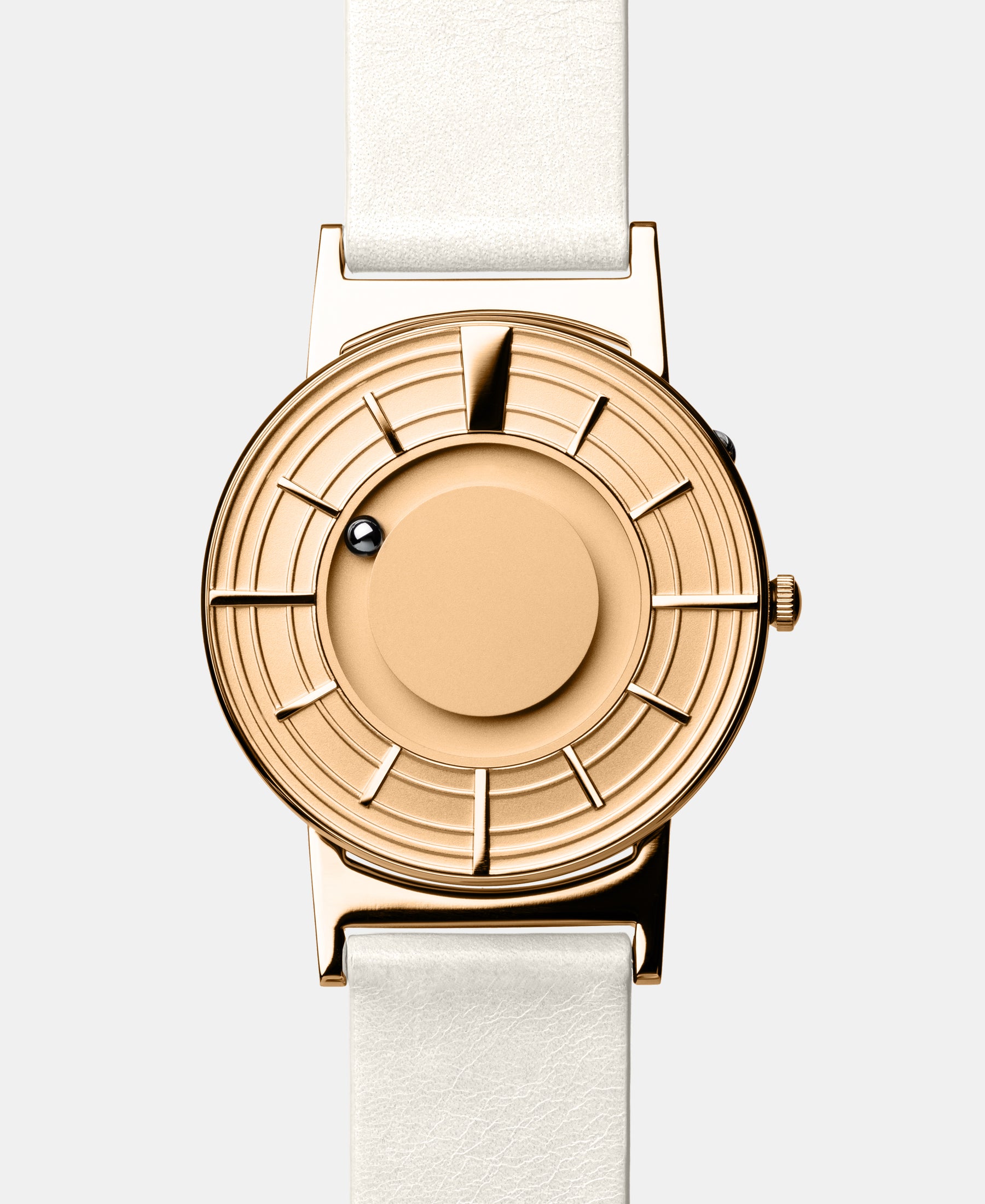 The Bradley timepiece features raised markers that allow you to feel the time by touch: a triangular marker for twelve, elongated line segments for three, six, and nine, and shorter line segments for the other markers. Two magnetized ball bearings travel around the watch face in separate, recessed tracks: one track around the center of the watch face for the minute, and one track around the outside edge of the watch face for the hour.